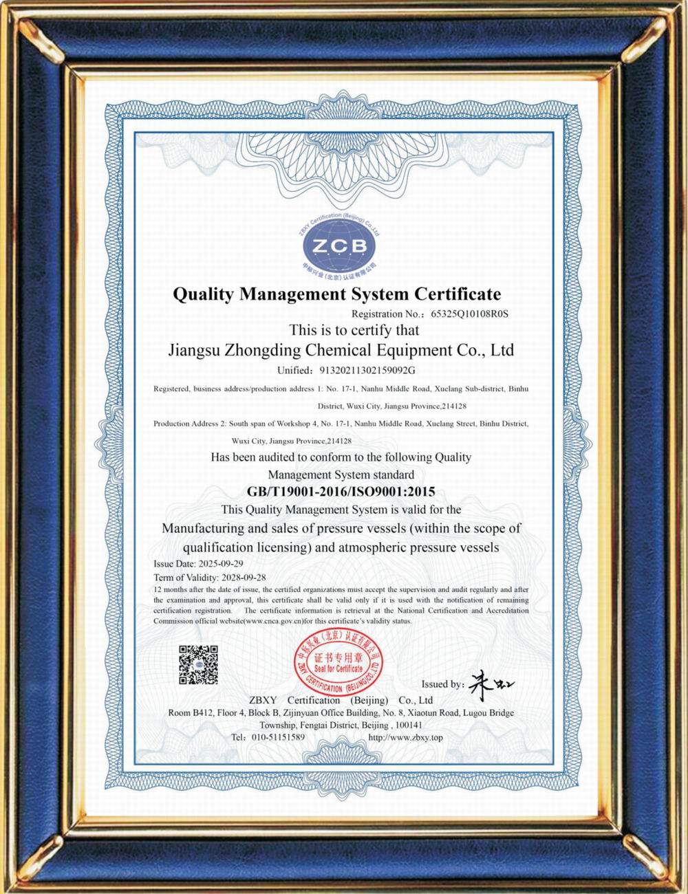 ISO9001質(zhì)量管理體系證書(英文版)