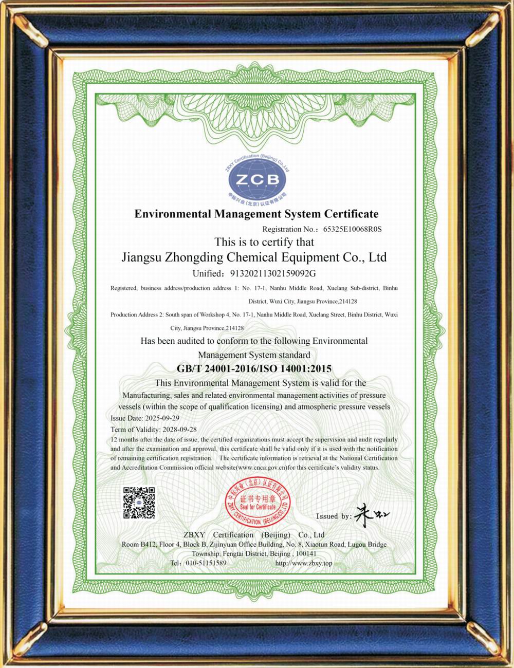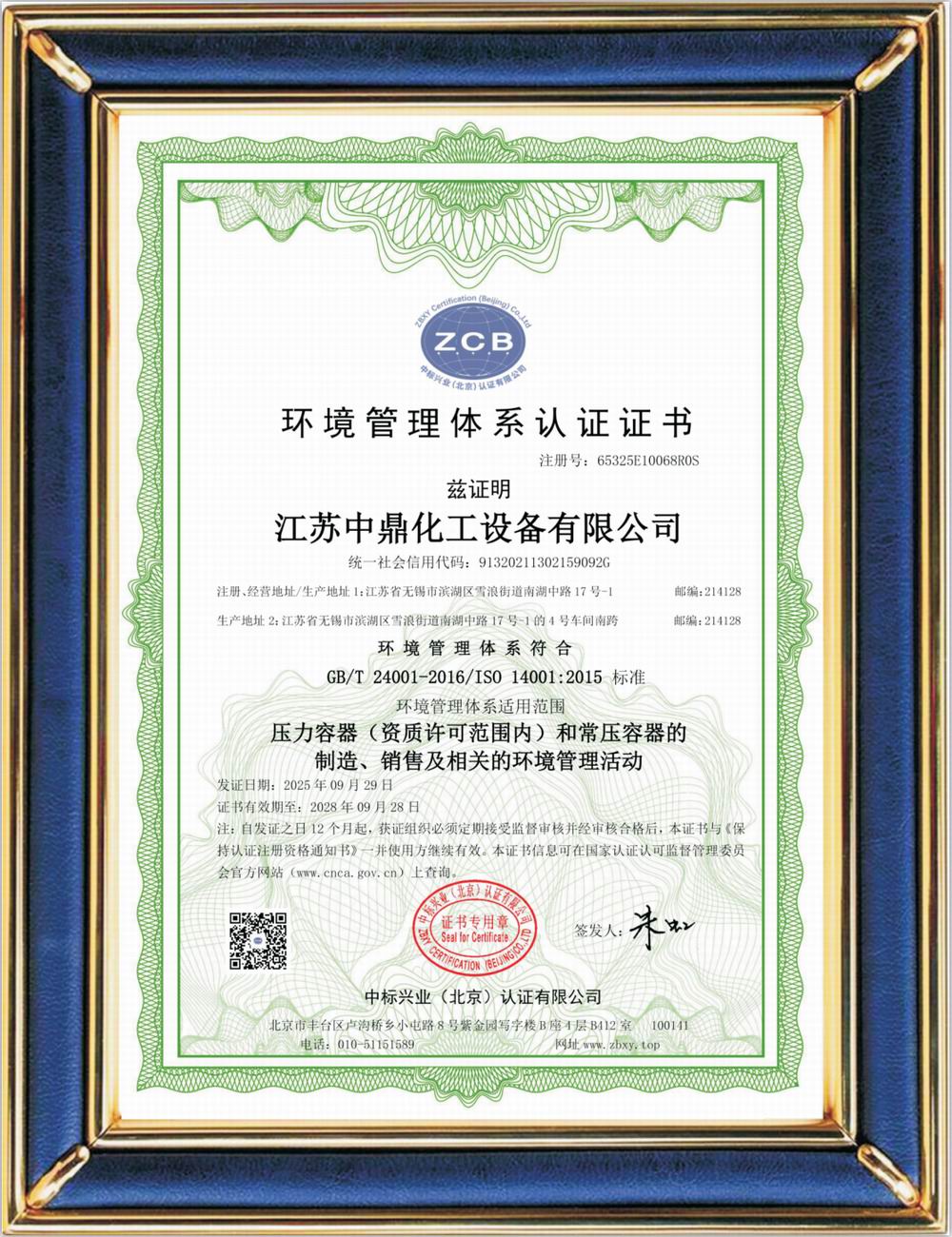 ISO14001環(huán)境體系認(rèn)證證書