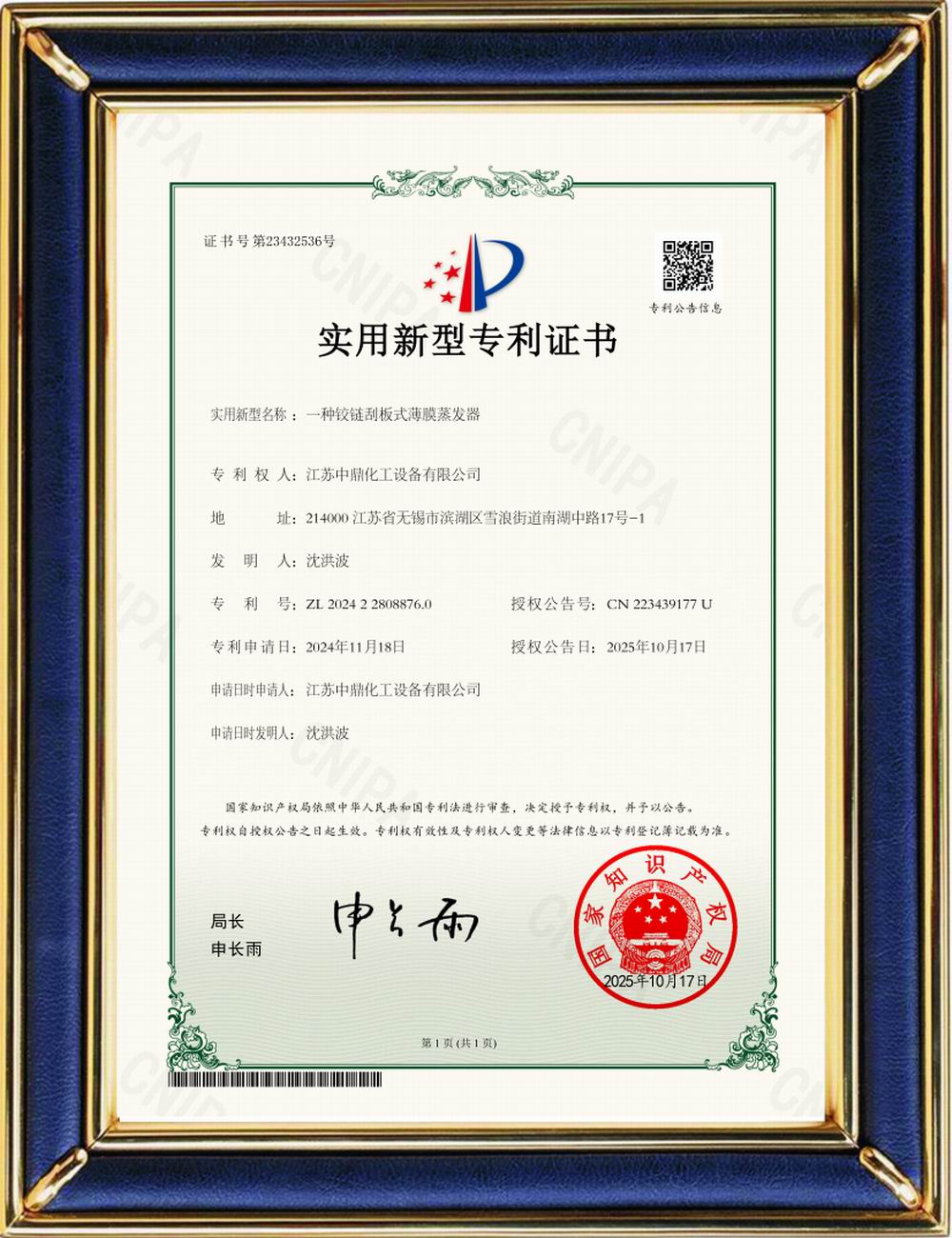 鉸鏈刮板式薄膜蒸發(fā)器(專利證書)