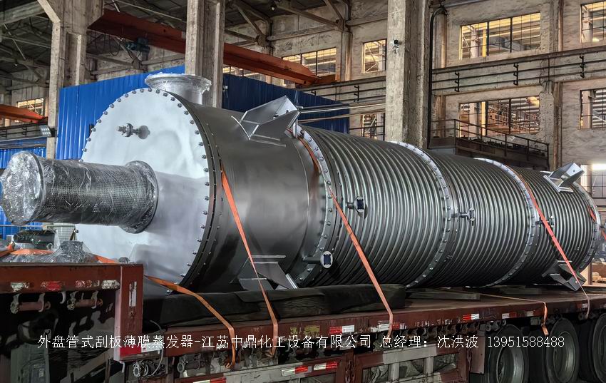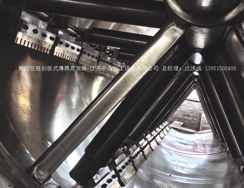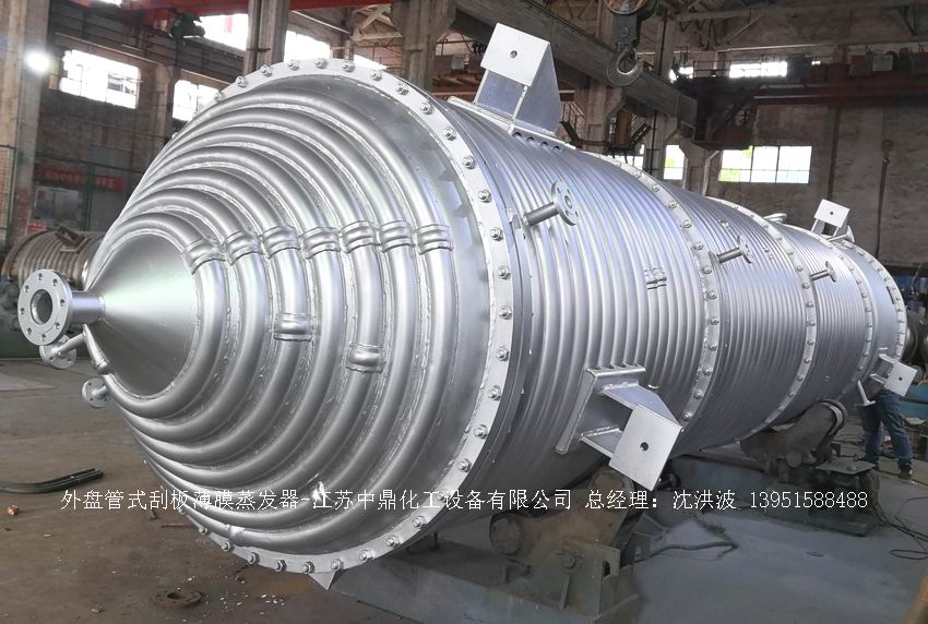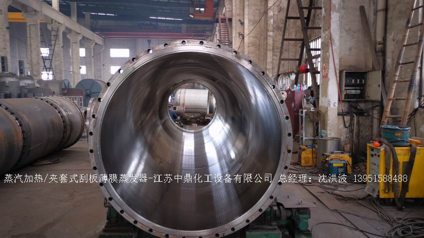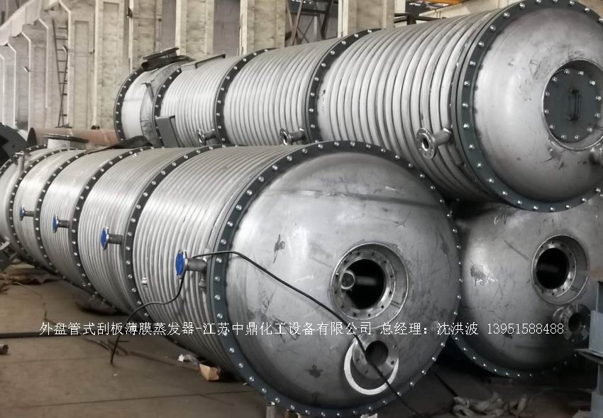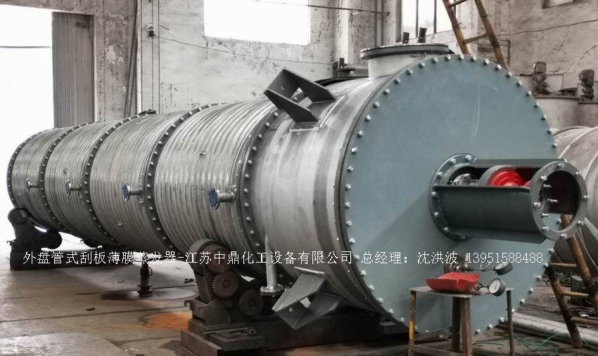 江蘇中鼎化工設(shè)備有限公司--離心式刮板薄膜蒸發(fā)器主要由加熱外盤半管式夾套(半管夾套內(nèi)走蒸汽,導(dǎo)熱油,熔鹽或者熱水等循環(huán)給蒸發(fā)器外壁加溫,通過熱傳導(dǎo),把蒸發(fā)器內(nèi)壁形成的物料薄膜中的水份蒸發(fā)減少,提高物料的濃度百分比。一般設(shè)計(jì)壓力為0.3mpa~2.5mpa左右,