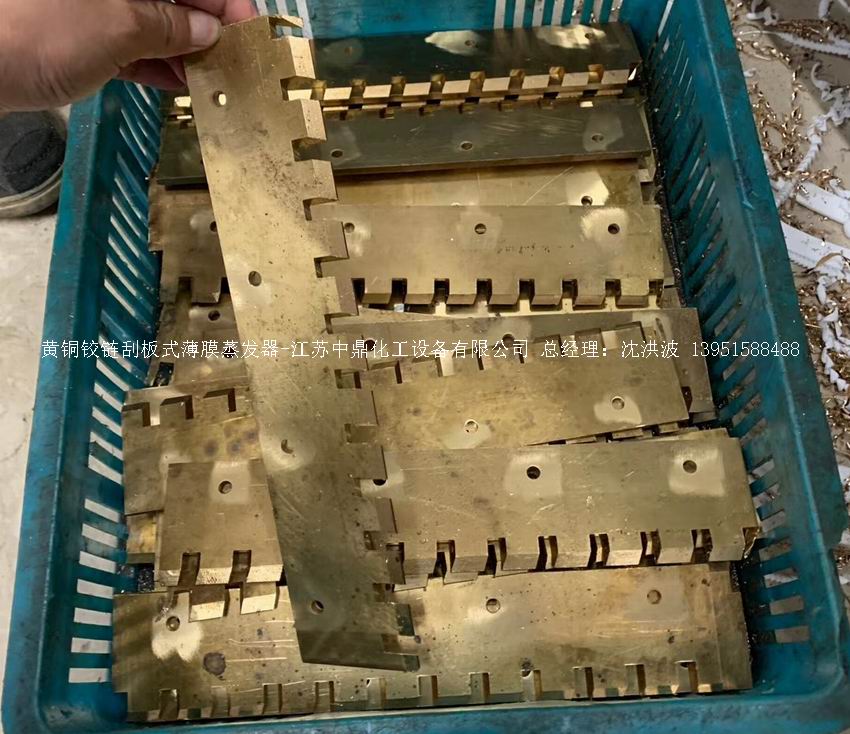 滑動(dòng)刮板:最基本常見,安裝在轉(zhuǎn)子刮板導(dǎo)槽內(nèi),受離心力沿徑向甩向蒸發(fā)筒體內(nèi)壁,隨轉(zhuǎn)子圓周運(yùn)動(dòng)。使物料呈膜狀湍流,提高傳熱系數(shù),抑制過熱等現(xiàn)象。低于180℃用玻纖聚四氟材質(zhì),高于180℃~250℃用碳纖維四氟材質(zhì),端面有導(dǎo)液槽。